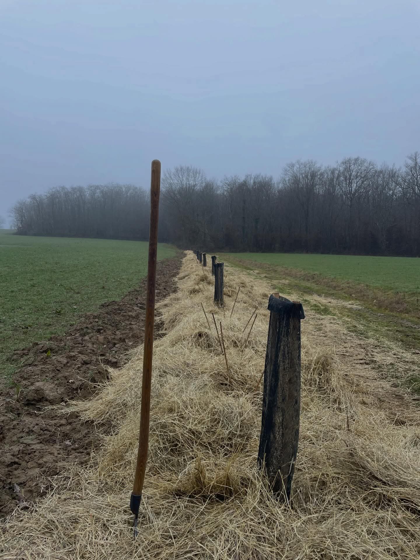 Cette semaine, nous paillons les arbres avec Romane pour garantir une bonne croissance cette année. Nous allons aussi utiliser les quelques arbres en plus pour reboucher les trous dans la haie plantée l'année dernière.